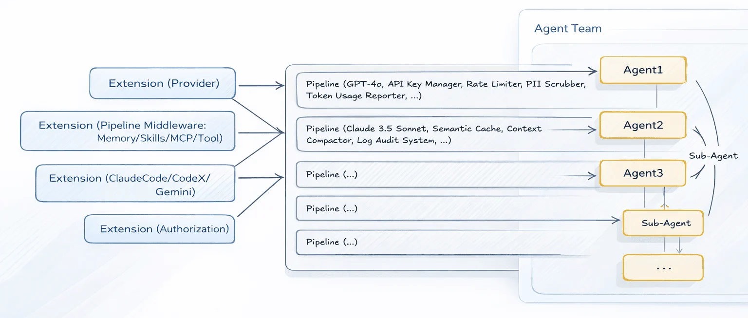 量级的核心引擎自动处理 AI 智能体复杂的生命周期 —— 从消息交互、流式输出到工具执行,一气呵成。